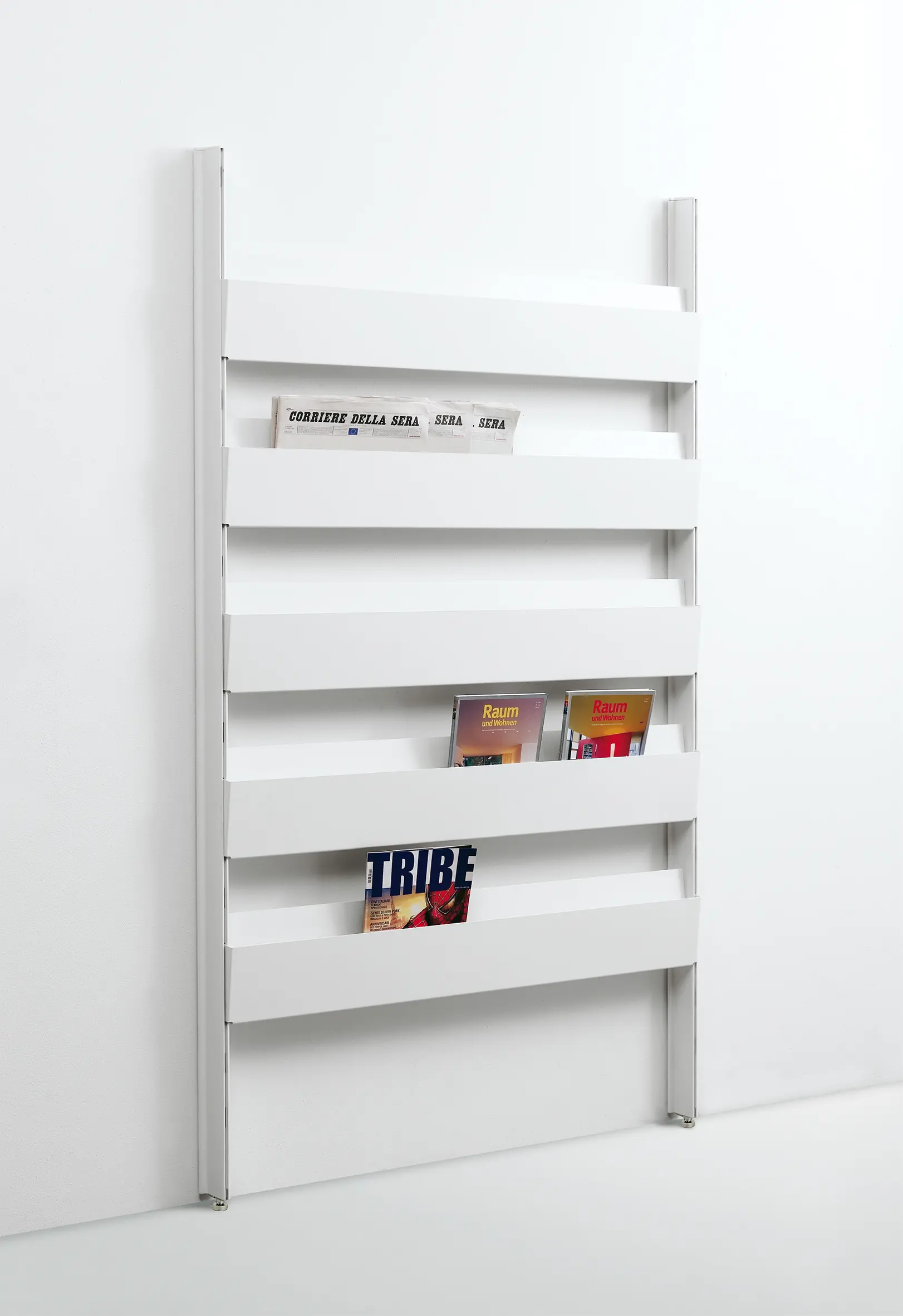 Struttura e ripiani, dritti oppure inclinati, disponibili in due colorazioni, bianco o grigio argento, integrabili con numerosi accessori tra cui elementi fermalibro, portariviste e barre porta-abiti.